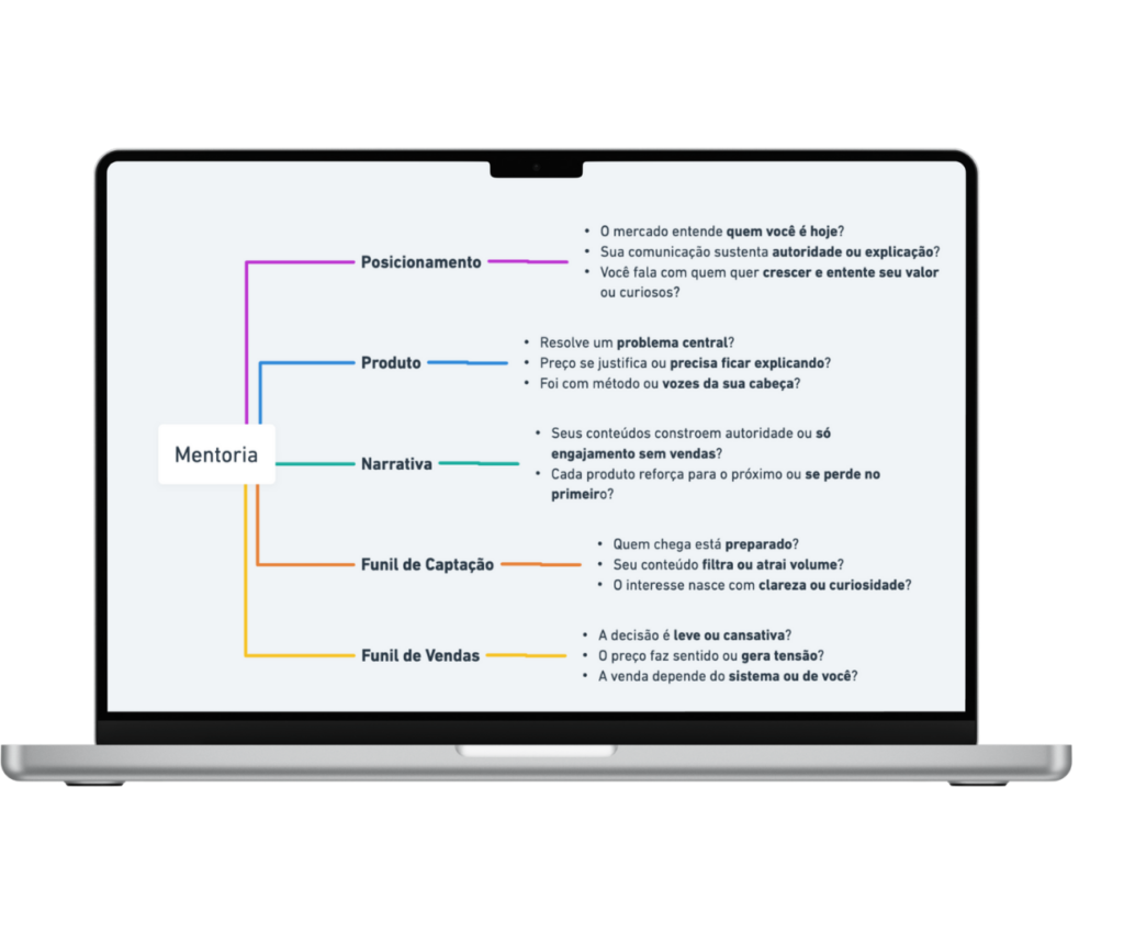 Você terá uma leitura clara e sem rodeios da sua mentoria, identificará onde está o desalinhamento entre produto, posicionamento e valor percebido e ganhará clareza para decidir o próximo passo sem recomeçar do zero.